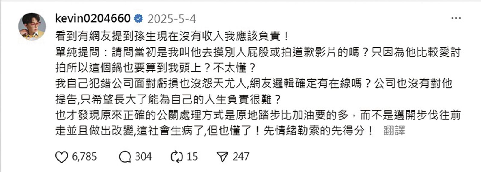 不過,先前對於孫生說酷炫分配不公,以及在孫生出事後與其解約遭粉絲砲轟,酷炫曾表示:「大家離開就是因為我不處理未爆彈,百人斬出事沒工作的時候,公司包庇他,換來的是去外面亂簽約,之後又哭著回來求我幫他,各種擦屁股,一再循環…」「過了十年沒有看到改變,他依舊是我的兄弟,但透過社會的洗禮他才會長大,就算最後他進去關,我也會去看他。只因為他比較愛討拍所以這個鍋也要算到我頭上?不太懂?我自己犯錯、公司面對虧損也沒怨天尤人,網友邏輯確定有在線嗎?公司也沒有對他提告,只希望長大了能為自己的人生負責很難?」對於孫生,酷炫曾經如此公開說道。